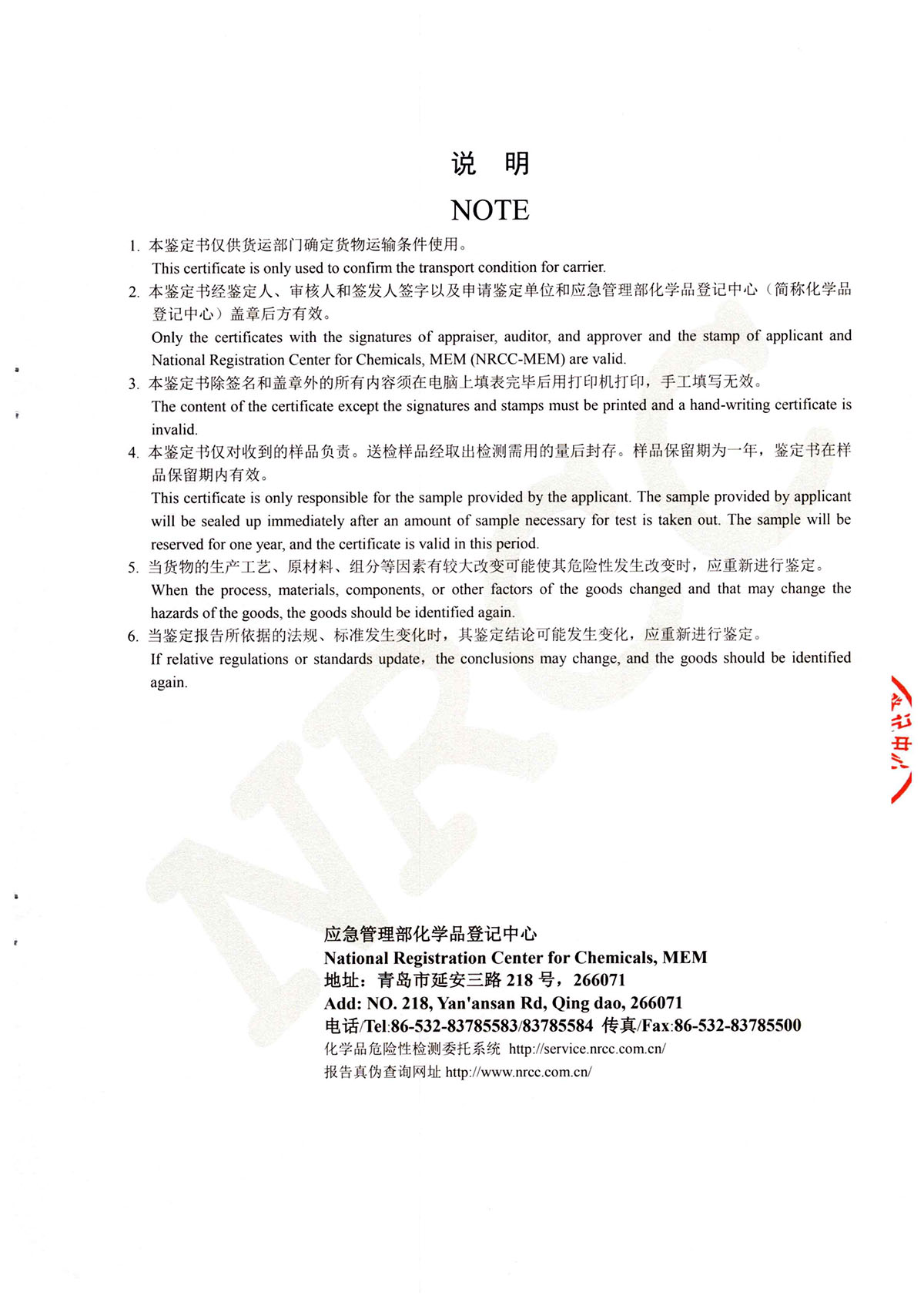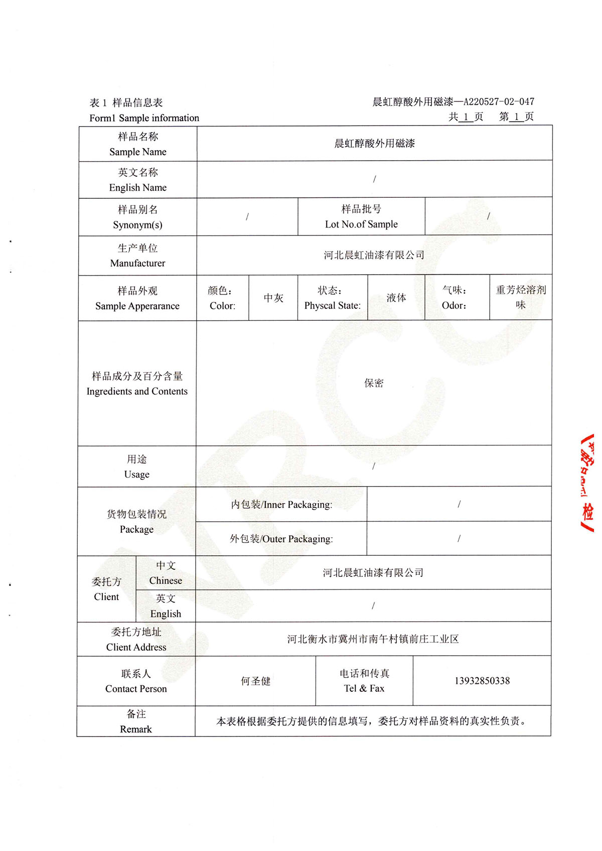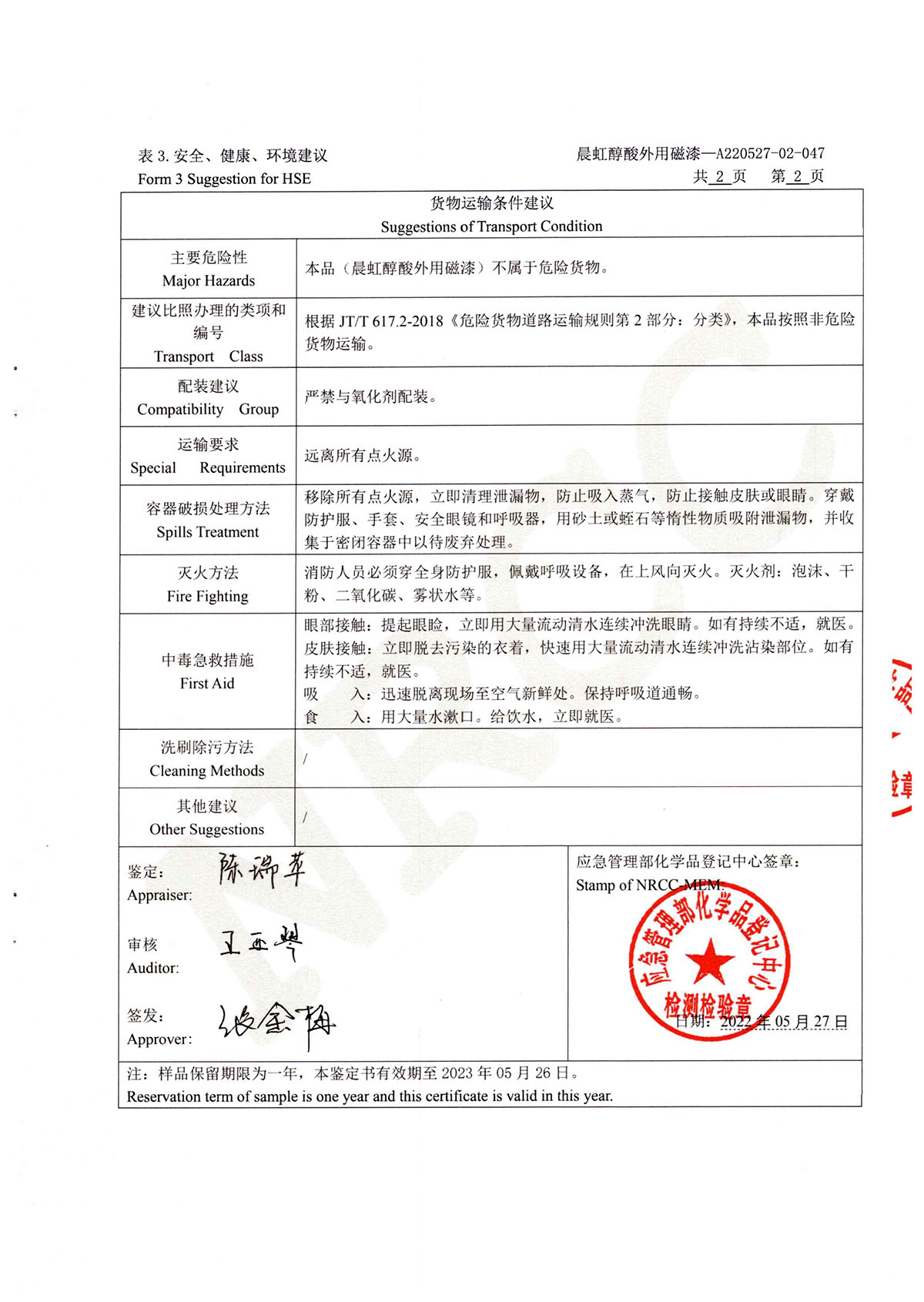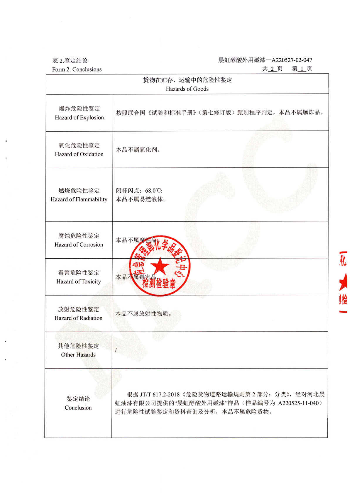 晨虹醇酸外用磁漆道路貨物運輸鑒定書