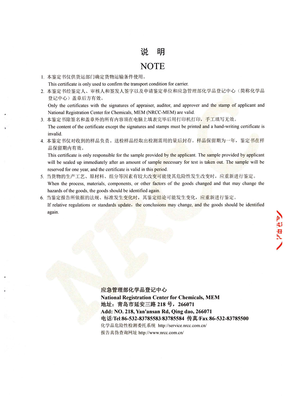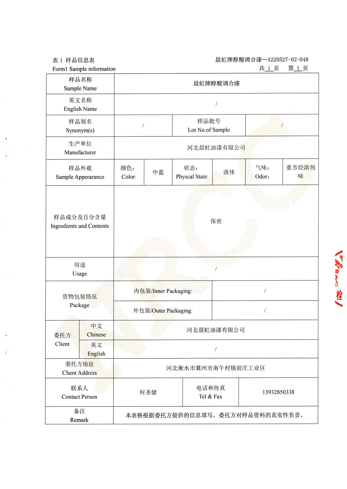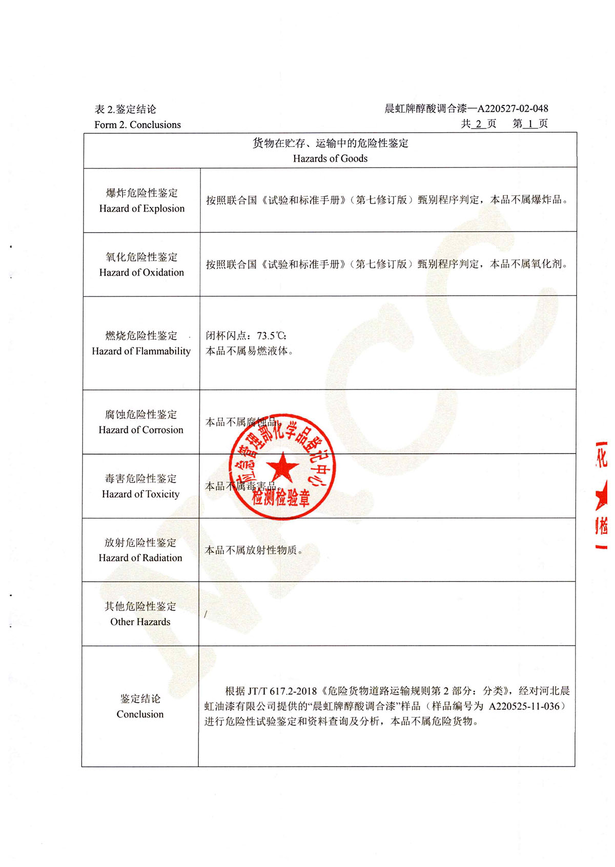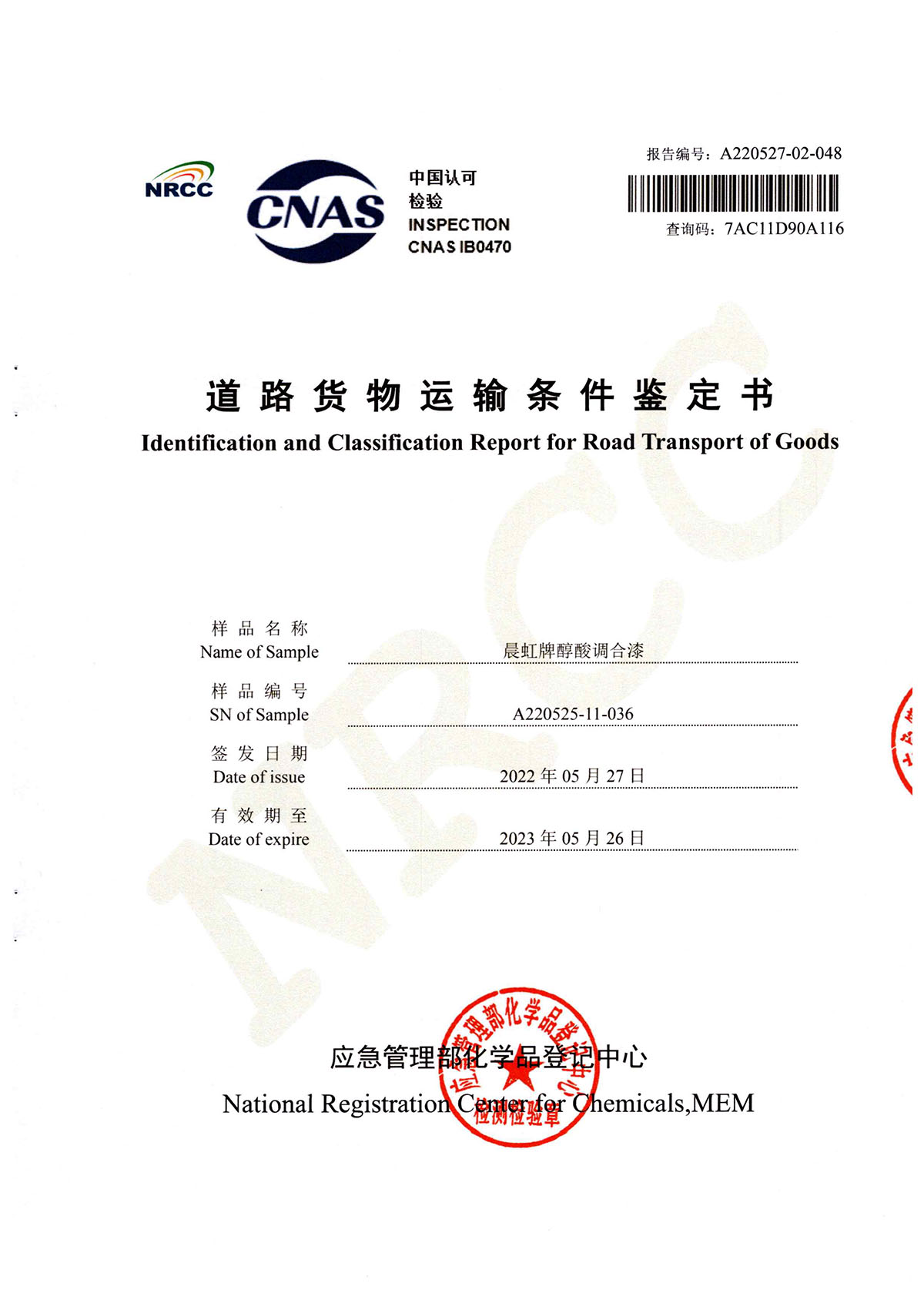 晨虹醇酸調合漆道路貨物運輸鑒定書